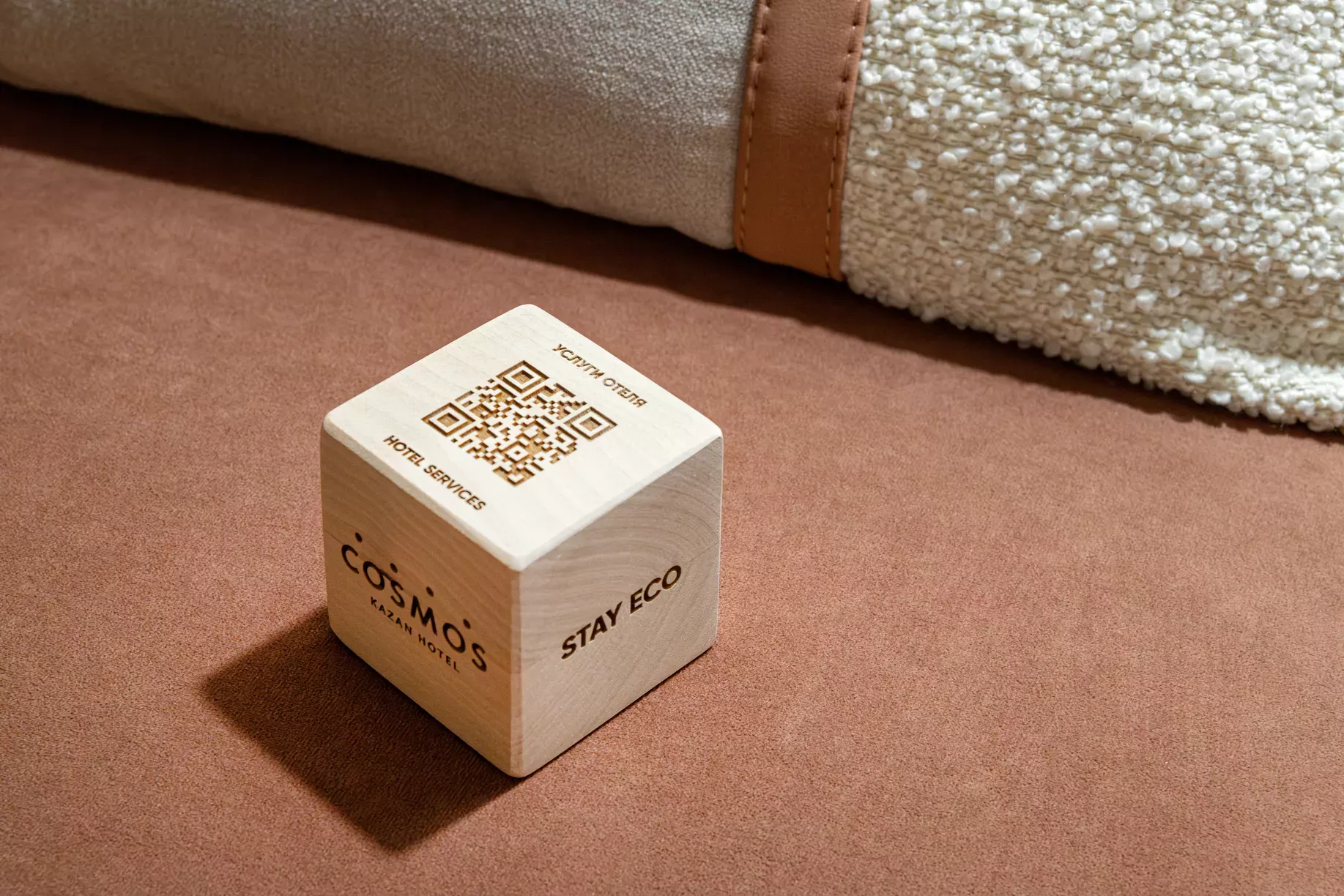 В номере на прикроватной тумбе вы сможете найти деревянный куб с помощью которого сможете заказать еду в номер, выбрать подушку для ещё более комфортного сна и ознакомиться с дополнительными услугами отеля.